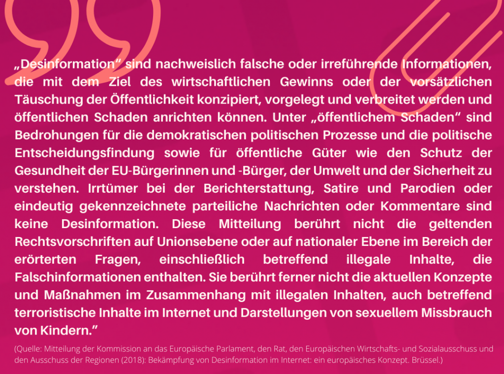 Ausführlichere Überlegungen zur Definition von Desinformationsbegrifflichkeiten behandeln auch die Ausgangspunkte und Entstehung von Desinformation.