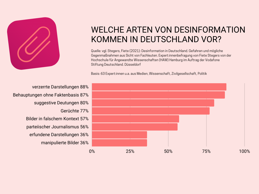 Desinformation kann auf allen Kommunikationskanälen verbreitet werden, entweder unmittelbar durch Personen oder durch technische Lösungen und bedient sich aller sprachlichen und visuellen Manipulationsmöglichkeiten, um Inhalte zu verfälschen.