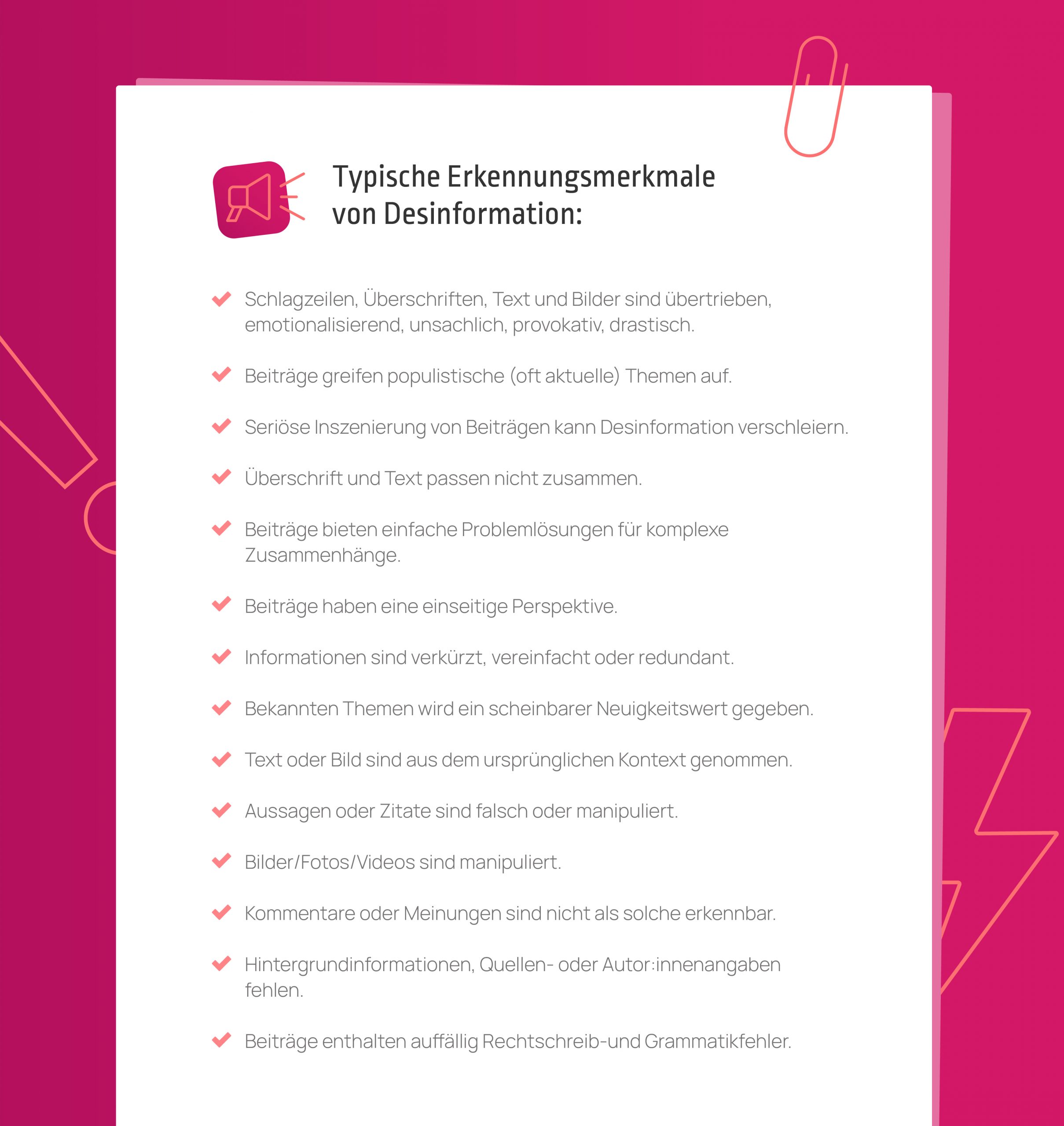 Desinformation kann anhand typischer Erkennungsmerkmale überprüft werden. Charakteristisch sind emotionale Zugänge und Darstellungen sowie einfache Erklärungen oder Lösungen für komplexe Zusammenhänge. Für die Manipulation werden dabei sowohl visuelle wie auch inhaltliche Mittel genutzt.